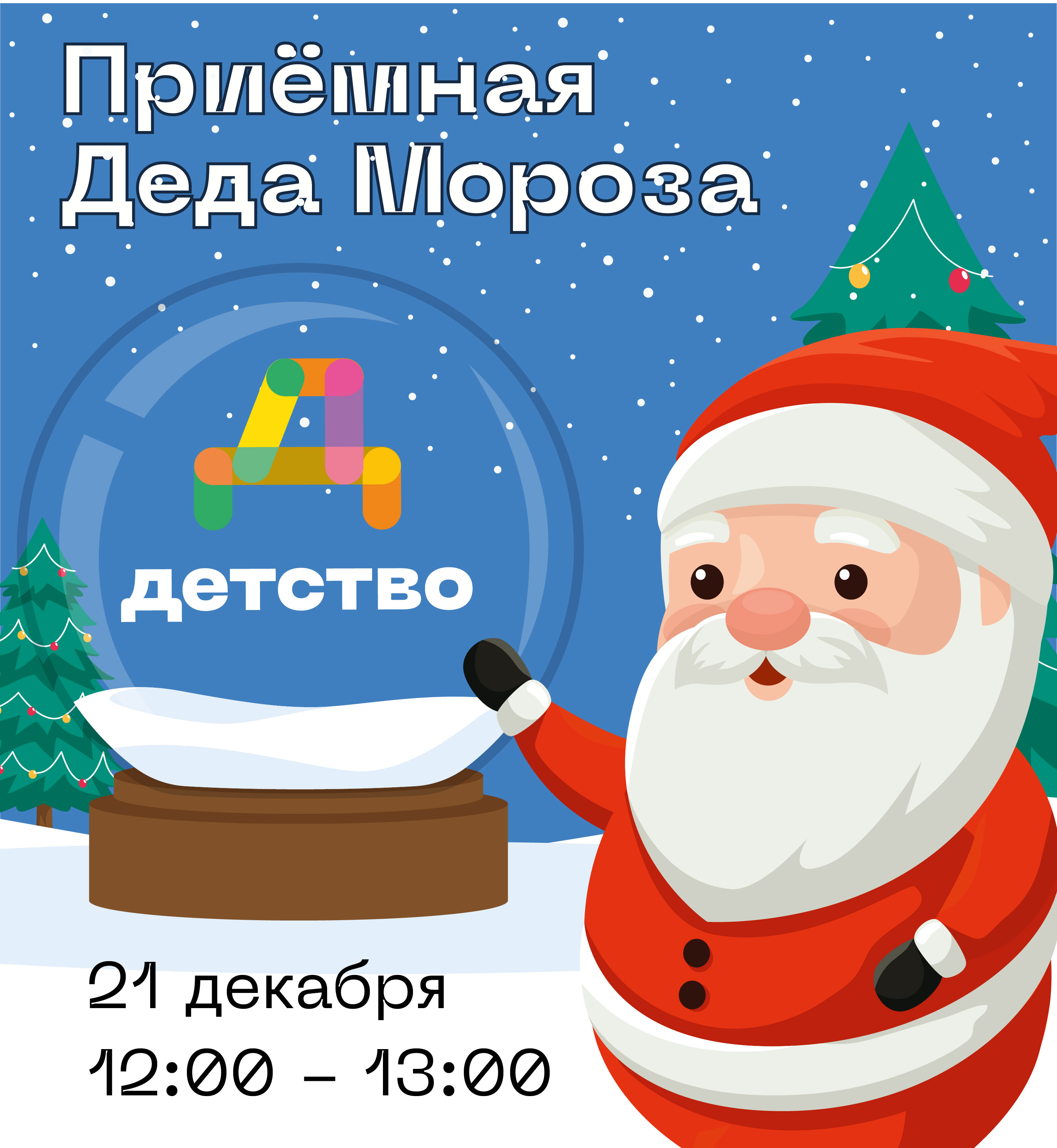 21 декабря с 12:00 до 13:00 в торговом центре "Детство" сказочный Дед Мороз и его помощники Мишка и Зайка организовывают настоящую приемную Деда Мороза, в которой будут ждать всех желающих.